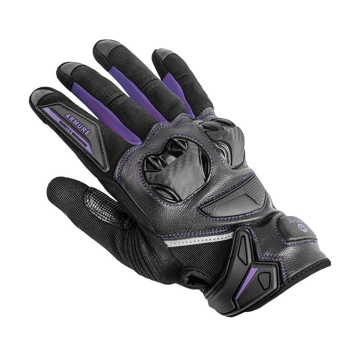 Armure Astrid Vented Lady Gloves Black/Purple. Aggressively designed short gloves with a specific fit for women, made of a combination of goatskin and polyester mesh. They incorporate TPU protections on the knuckles and on the side of the palm with a carbon finish. They allow you to use a touch screen device without having to remove your gloves.