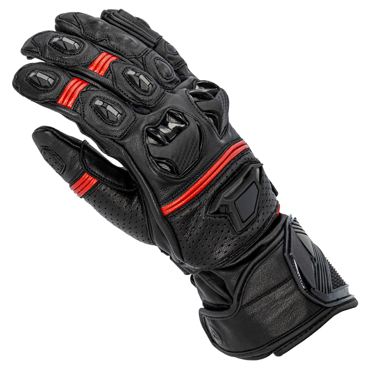 Armure Drake Gloves Black / Red. Racing style gloves made of highly abrasion-resistant goatskin. They incorporate TPU protections in the knuckle area, on the cuff and strategically located reinforcements for additional protection.