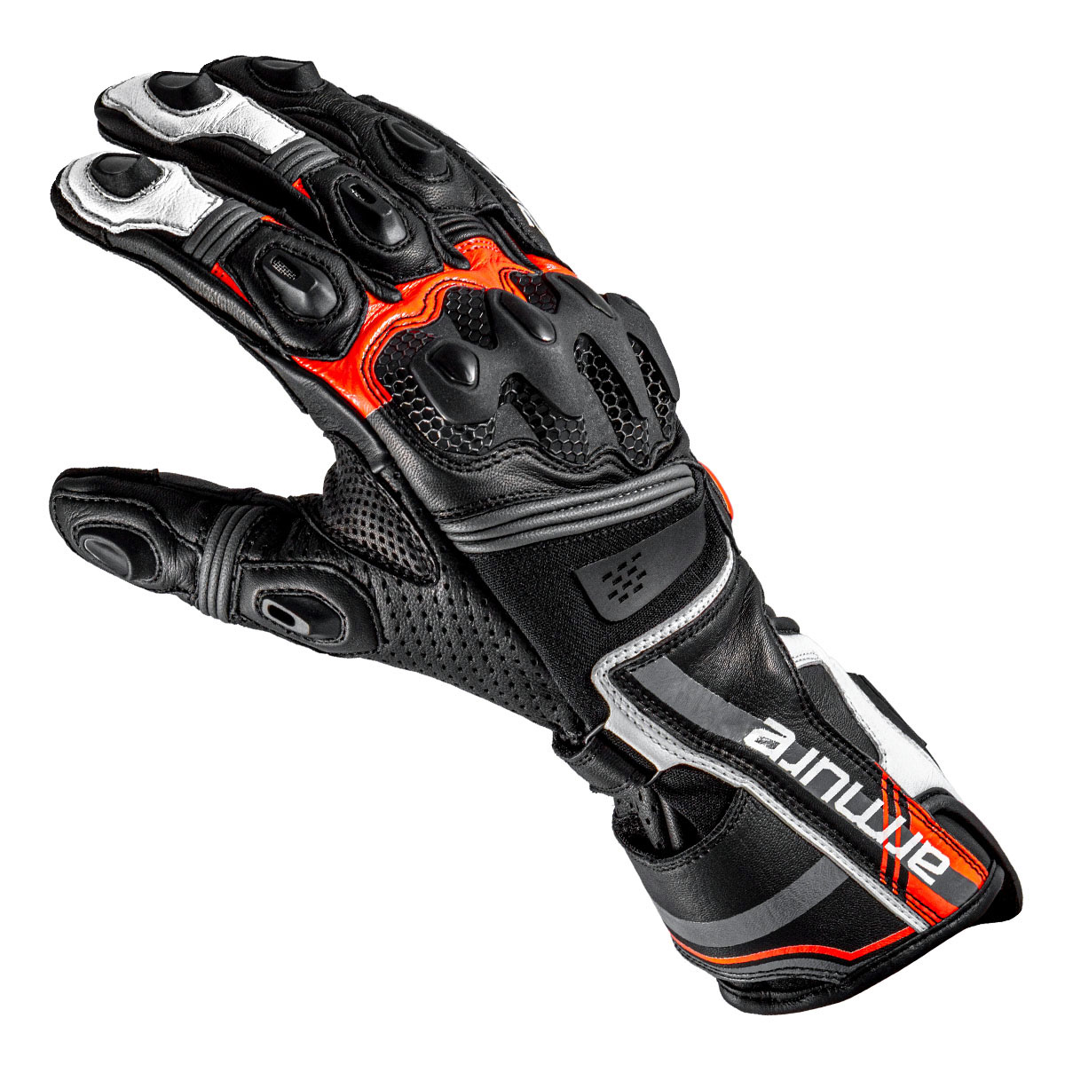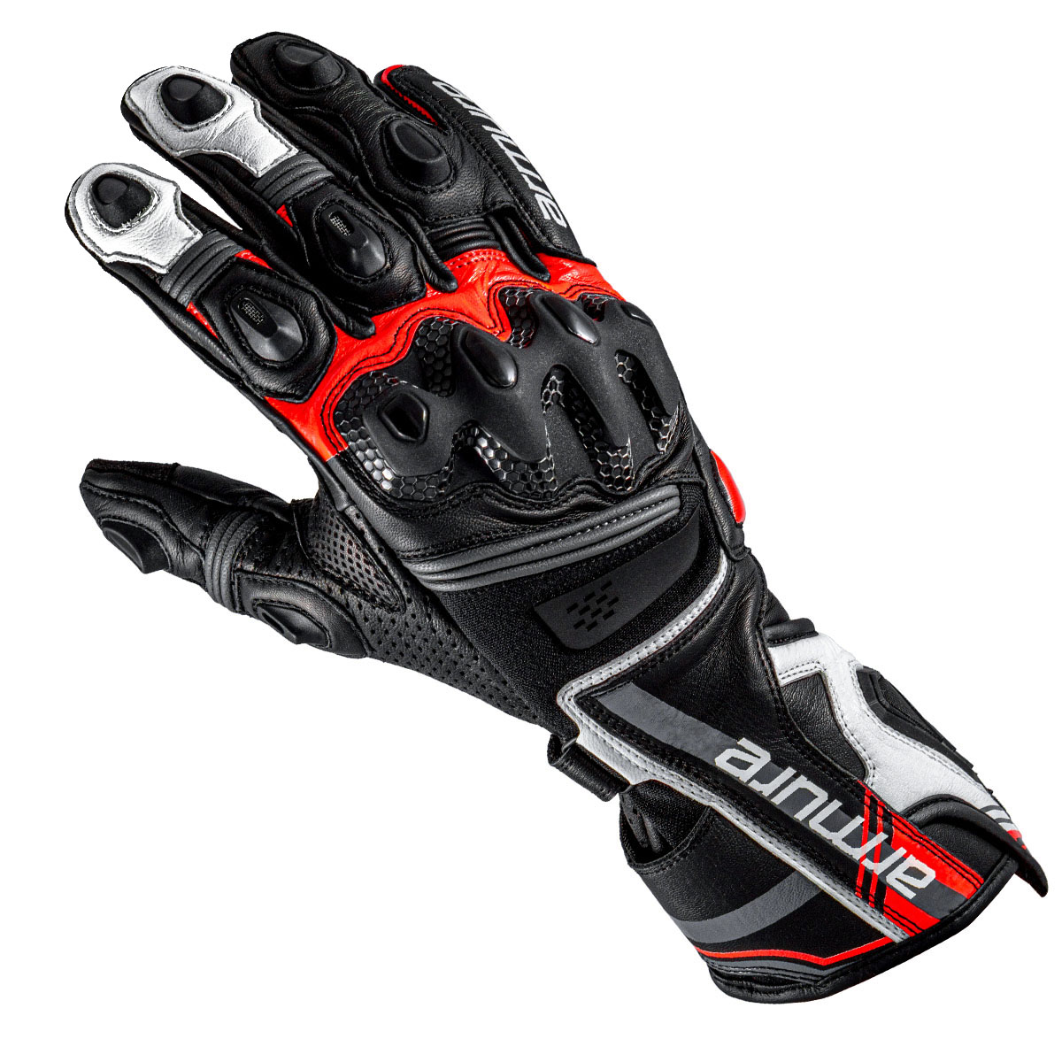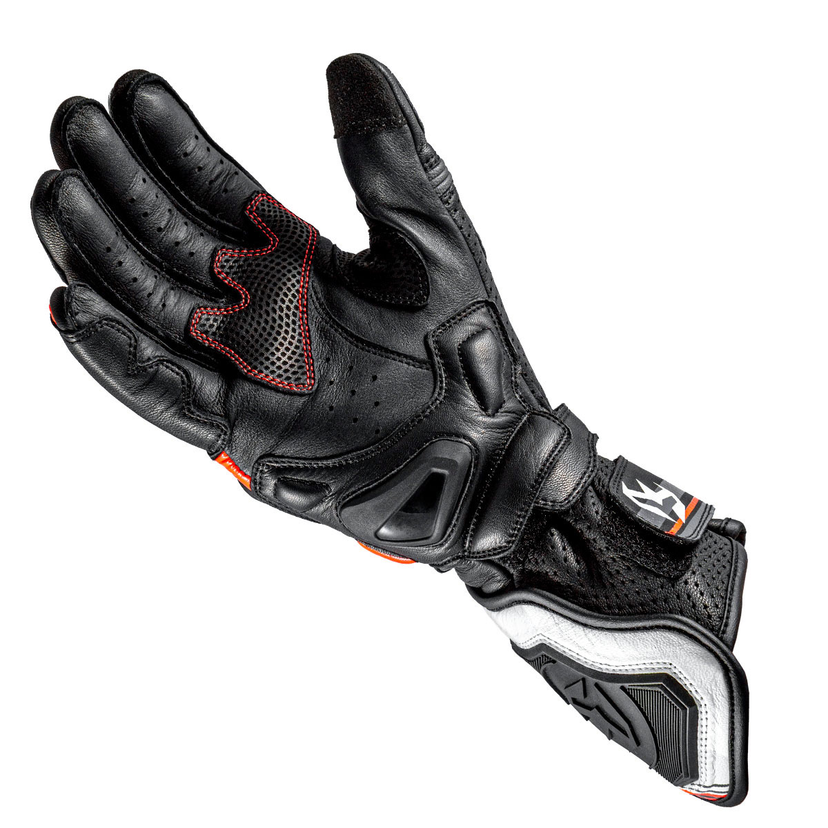 Armure Ryder Gloves in Black / White / Red. Racing-style gloves crafted from kangaroo and goatskin, materials renowned for their excellent abrasion resistance and lightweight construction. They featureDigital Cow HideandCordura leather reinforcements for increased durability. The palm featuresAX Suede Fit Connectfor touchscreen compatibility and additional reinforcements in critical areas. Equipped with rigid protection and strategically placed padding, they ensure safety and comfort for sporty riding.