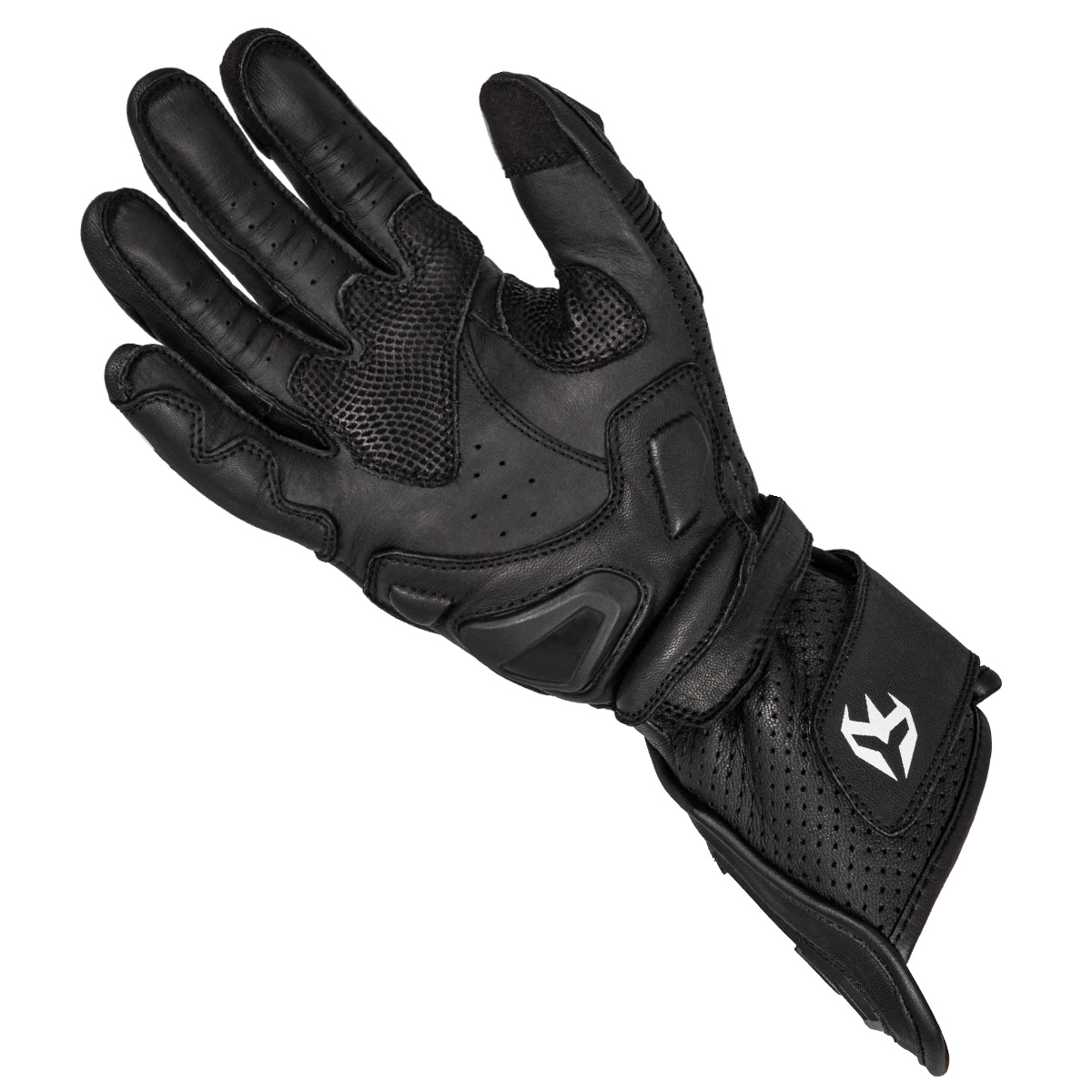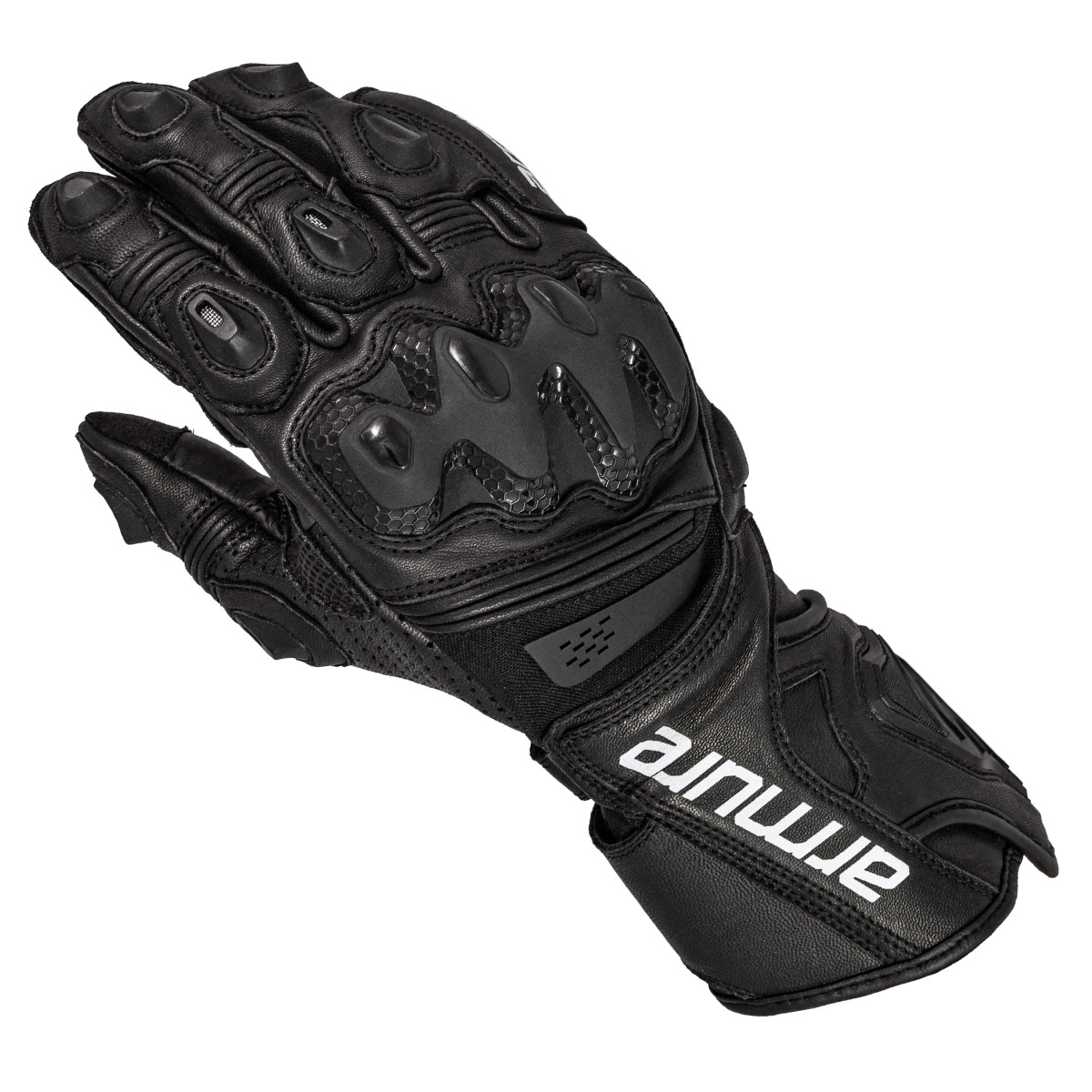 Armure Ryder Black Gloves. Racing-style gloves crafted from kangaroo and goatskin, materials renowned for their excellent abrasion resistance and lightweight construction. They featureDigital Cow HideandCordura leather reinforcements for increased durability. The palm featuresAX Suede Fit Connectfor touchscreen compatibility and additional reinforcements in critical areas. Equipped with rigid protection and strategically placed padding, they ensure safety and comfort for sporty riding.