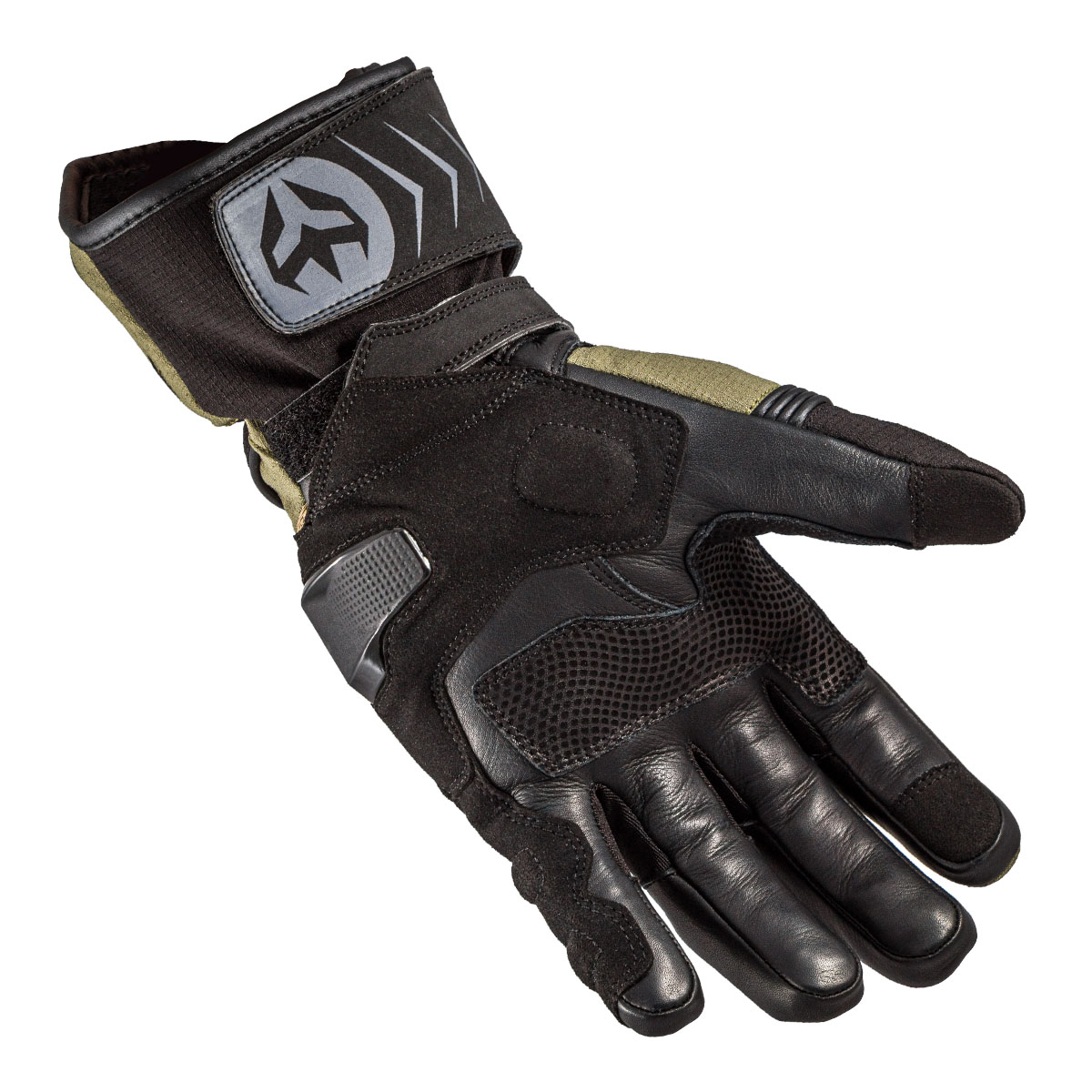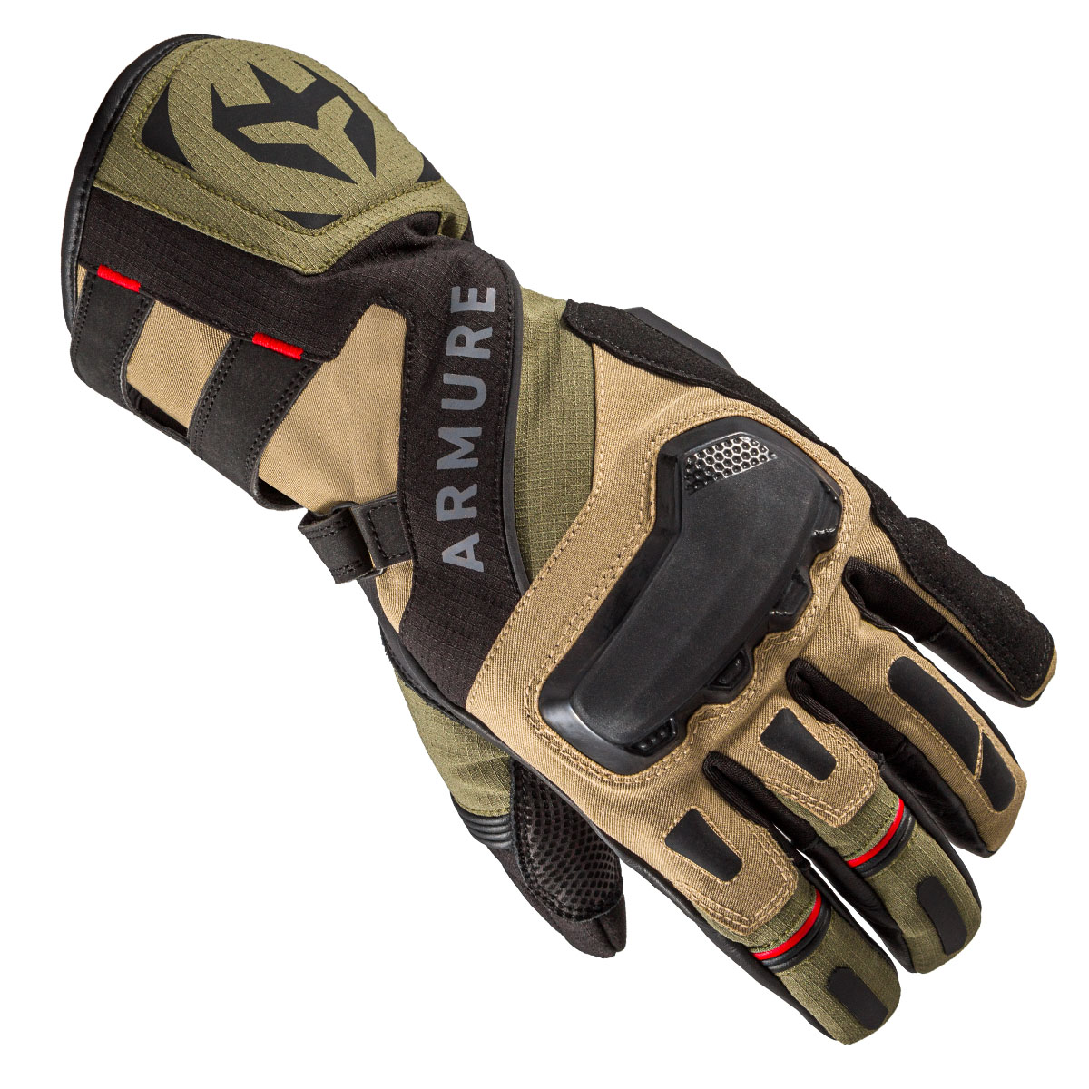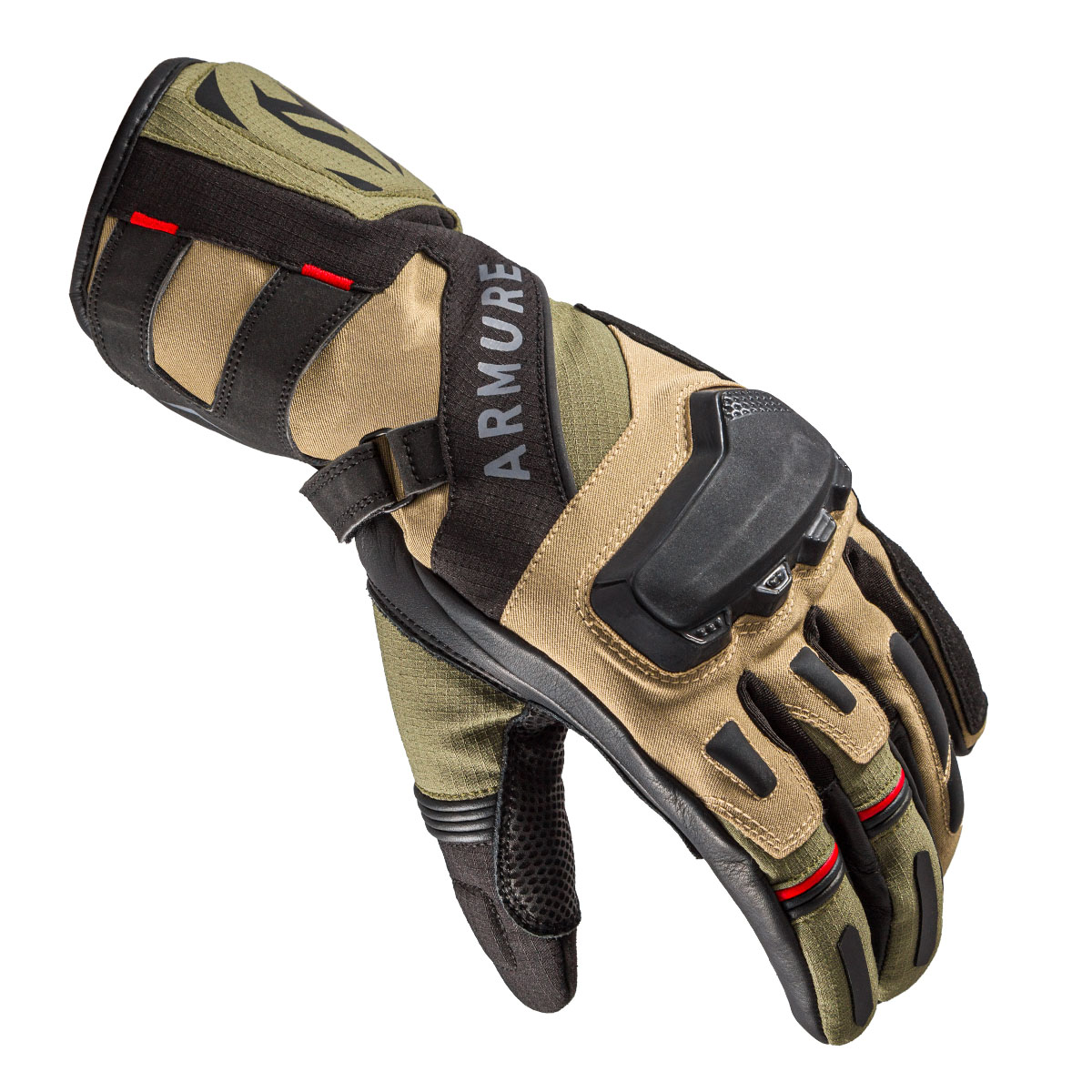 Armure Barton Waterproof Gloves in Green / Sand. Long touring-style gloves crafted from goatskin and Digital Cow Hide leather combined with Riptex, Stretch Taslan, and Cordura fabric to ensure durability and comfort. Palms reinforced with Ammara material and AX Suede Fit Connect for touchscreen compatibility. They feature a waterproof and breathable membrane, as well as strategically placed padding and protection for safety and comfort while riding.