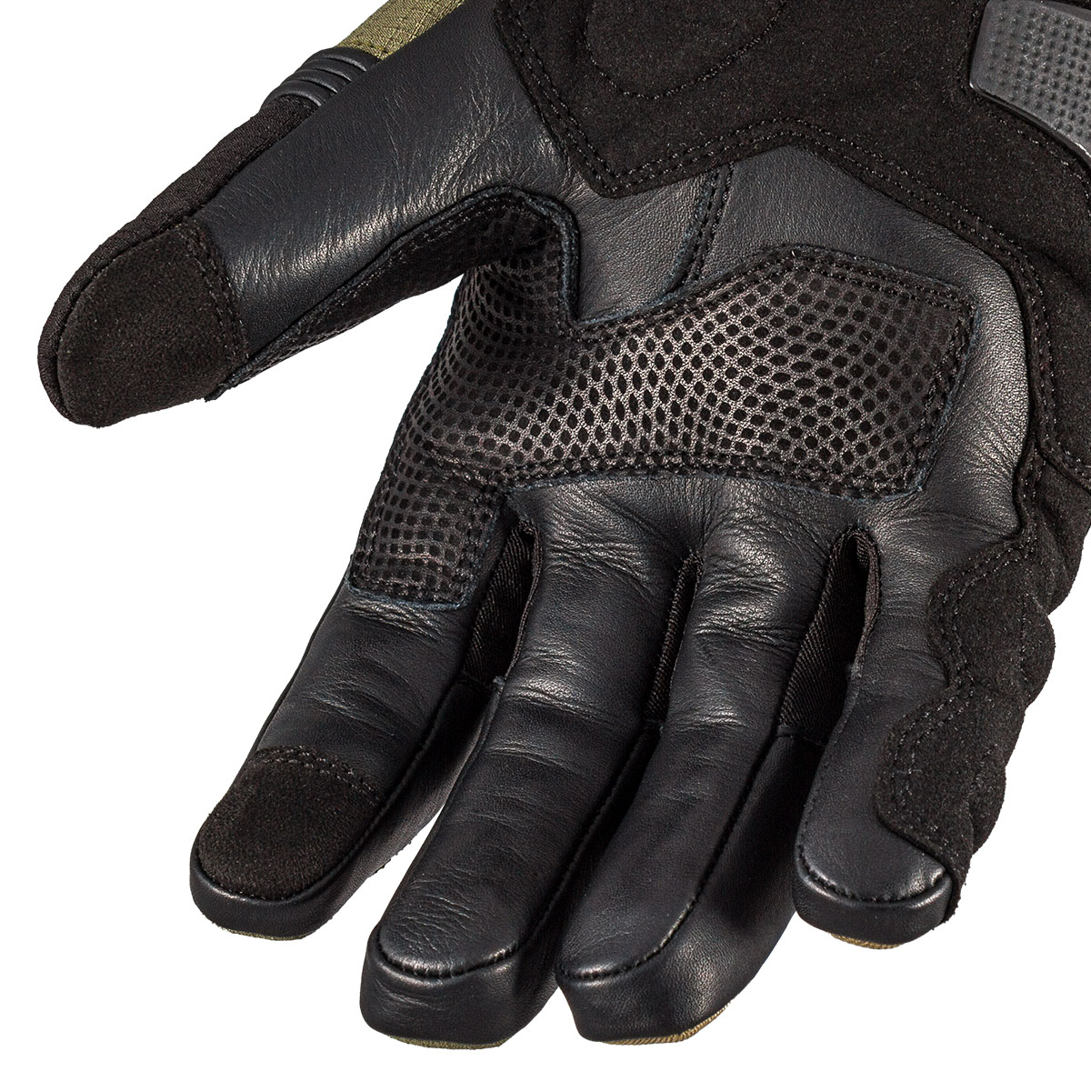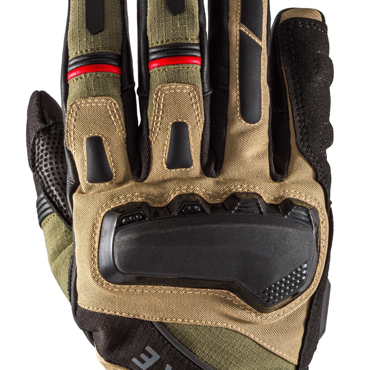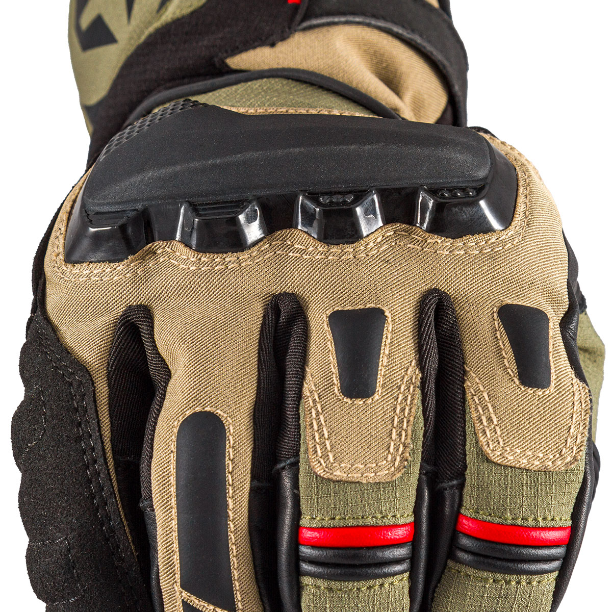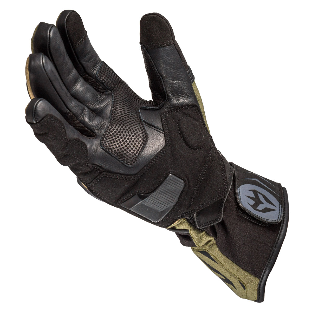 Armure Barton Waterproof Gloves in Green / Sand. Long touring-style gloves crafted from goatskin and Digital Cow Hide leather combined with Riptex, Stretch Taslan, and Cordura fabric to ensure durability and comfort. Palms reinforced with Ammara material and AX Suede Fit Connect for touchscreen compatibility. They feature a waterproof and breathable membrane, as well as strategically placed padding and protection for safety and comfort while riding.