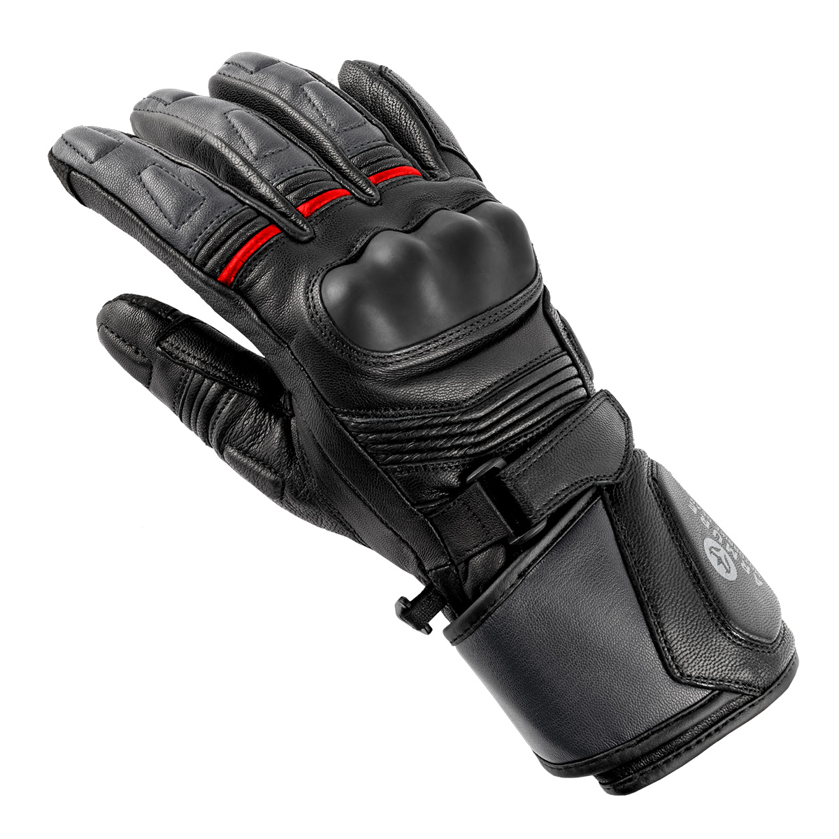 Armure Faust Long Waterproof Gloves Black/Grey. Long, touring-style gloves made of goatskin with a waterproof membrane. With built-in TPU protections on the knuckles and strategically placed reinforcements and padding. They allow you to use a touch screen device without having to remove your gloves.