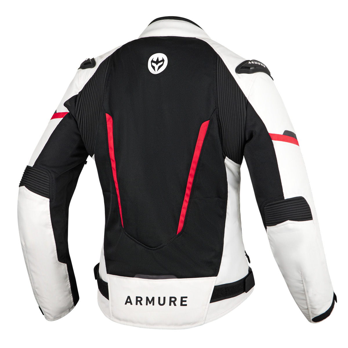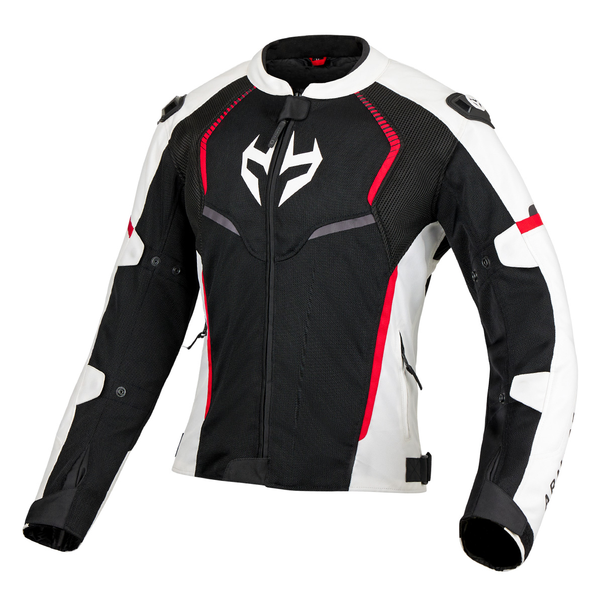 Chaqueta Armure Astrid Vented AA Lady Negra / Blanca / Roja. Chaqueta ventilada de estilo deportivo, confeccionada en poliéster 600D de alta resistencia para garantizar un equilibrio óptimo entre protección y ventilación. Incorpora forro cortavientos extraíble, protecciones certificadas en hombros y codos, y un diseño ergonómico para ofrecer la máxima comodidad en conducción.