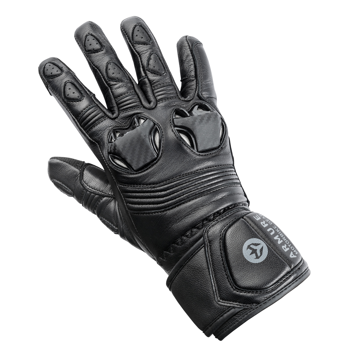 Guantes Armure Bentley Lady Negros. Guantes largos de estilo touring para mujer confeccionados en piel de cabra con membrana impermeable. Incorpora protecciones integradas de TPU en los nudillos y refuerzos y acolchados estratégicamente ubicados. Permiten utilizar un dispositivo de pantalla táctil sin tener que quitarse los guantes.