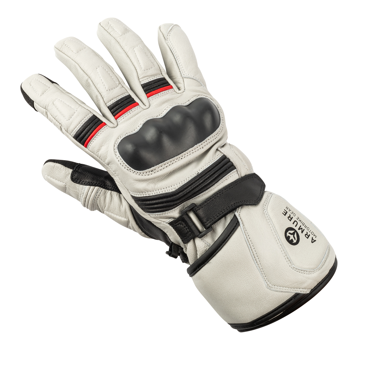 Guantes Armure Faust Long Waterproof Ivory. Guantes largos de estilo touring confeccionados en piel de cabra con membrana impermeable. Incorpora protecciones integradas de TPU en los nudillos y refuerzos y acolchados estratégicamente ubicados. Permiten utilizar un dispositivo de pantalla táctil sin tener que quitarse los guantes.
