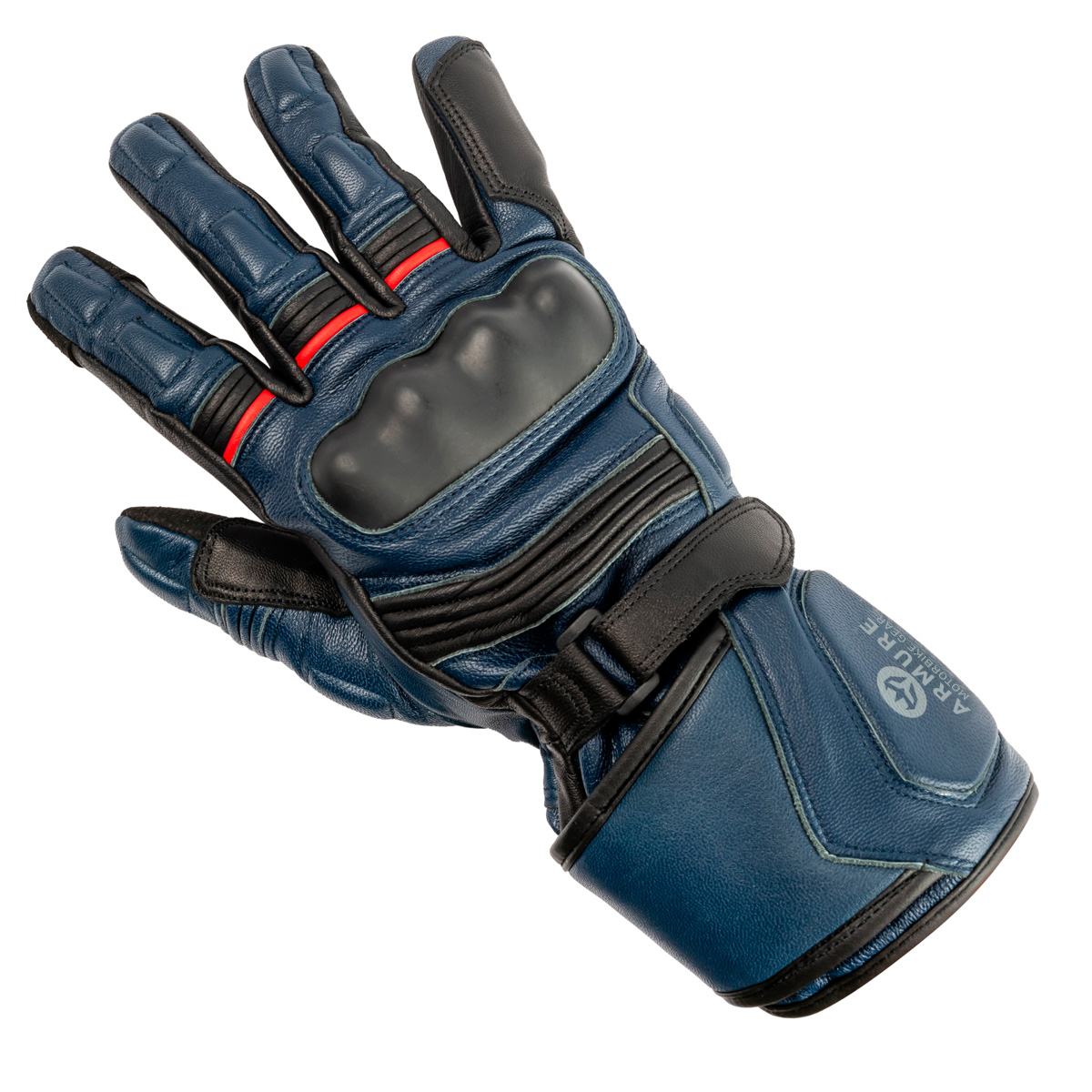 Guantes Armure Faust Long Waterproof Navy. Guantes largos de estilo touring confeccionados en piel de cabra con membrana impermeable. Incorpora protecciones integradas de TPU en los nudillos y refuerzos y acolchados estratégicamente ubicados. Permiten utilizar un dispositivo de pantalla táctil sin tener que quitarse los guantes.