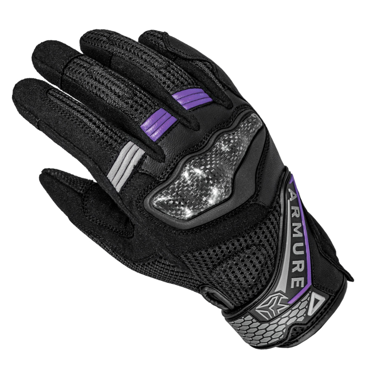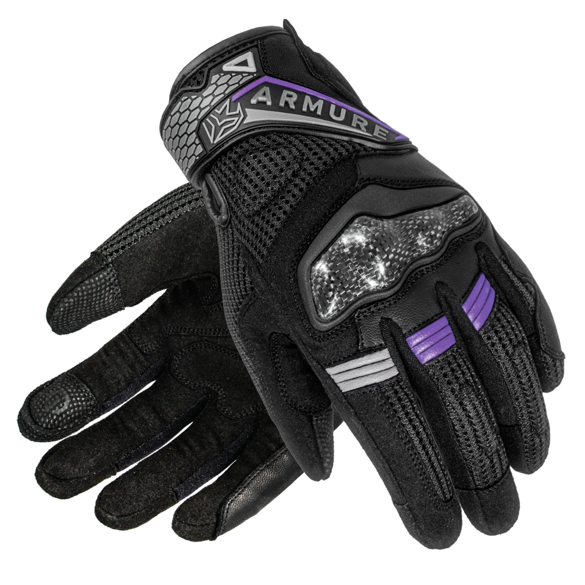 Guantes Armure Miller Negros / Lila. Guantes cortos con ajuste específico para mujer, confeccionados en una combinación de piel de cabra, malla transpirable y microfibra de ante. Incorporan protecciones de TPU en los nudillos y detalles reflectantes para mayor visibilidad. Permiten utilizar un dispositivo de pantalla táctil sin necesidad de quitarse los guantes.