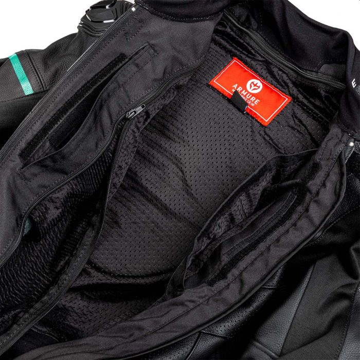 Mono professional Armure Drake Lady Negro / Menta. Mono profesional con ajuste específico para mujer, de alto rendimiento confeccionado en piel de vaca con microperforaciones estratégicamente ubicadas. Dispone de protectores internos certificados en hombros, codos y rodillas y de deslizaderas externas en los hombros y codos para mayor protección. Destaca por ofrecer altos niveles de seguridad y libertad de movimientos.